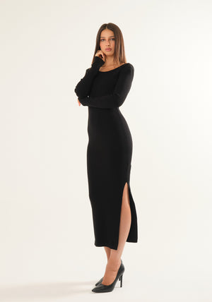 Abito lungo con profonda scollatura posteriore con laccio da annodare, maniche lunghe, ampio spacco laterale