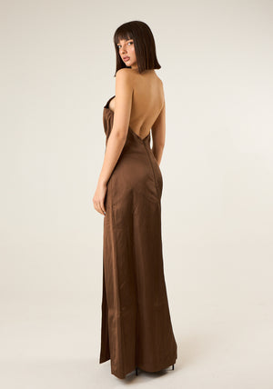 Abito lungo con spacco laterale, allaccio al collo regolabile, schiena nuda, chiusura posteriore con zip