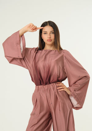 Blusa in fantasia sfumata logata, scollo rotondo, maniche lunghe a campana