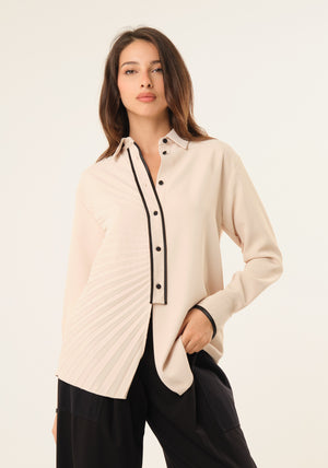 Camicia asimmetrica con lato plissetato, colletto classico, dettagli frontali a contrasto di colore, maniche lunghe, chiusura frontale con bottoni in tinta