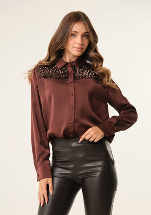 Camicia con carrè in paillettes, tessuto scivolato effetto raso, colletto classico, maniche lunghe, taglio allungato, fondo morbido