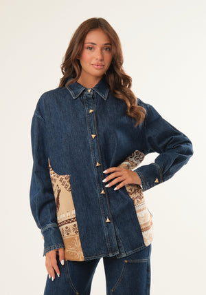 Camicia denim con inserti jacquard, taglio over, colletto classico, chiusura frontale con bottoni, maniche lunghe