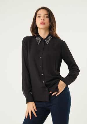 Camicia in georgette con applicazioni su colletto, taglio dritto, maniche lunghe, chiusura frontale con bottoni in tinta