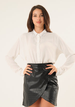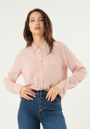 Camicia in georgette con applicazioni su colletto, taglio dritto, maniche lunghe, chiusura frontale con bottoni in tinta