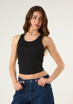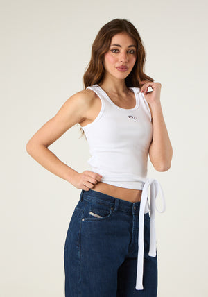 Canotta T-Anki-Tail con stringhe da avvolgere, scollo rotondo, over D ricamato a laser, schiena scoperta