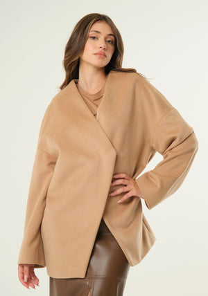 Cappotto corto senza collo, in panno a maniche lunghe con spalle morbide, tasche laterali a filetto, chiusura frontale con bottone a pressione, fodera interna
