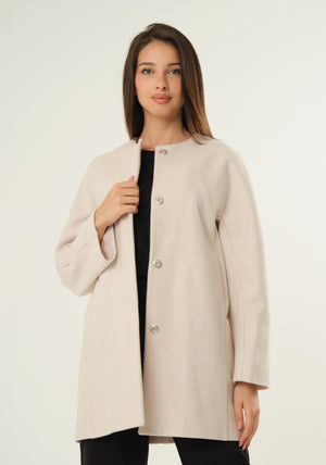 Cappotto girocollo in panno a maniche lunghe con spalle morbide, tasche laterali a filetto, chiusura frontale con bottoni a pressione, fodera interna