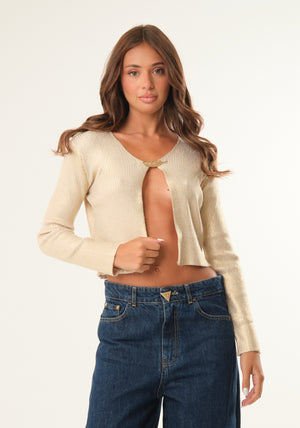 Cardigan metallizato a costine, maniche lunghe, scollo rotondo, chiusura con spilla a foglia