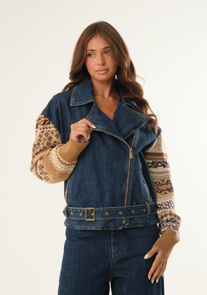 Chiodo in maglia jacquard e tessuto jeans, chiusura laterale con zip, cintura coordinata removibile, tasche laterali