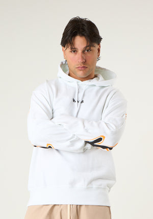 Felpa basic con piccola stampa frontale e grande stampa posteriore, taglio dritto, cappuccio fisso con coulisse, dettagli in maglia elastica