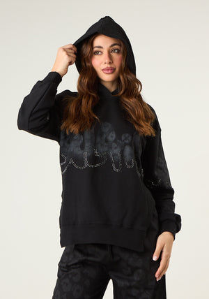 Felpa con cappuccio e applicazioni preziose, stampa frontale animalier, cappuccio fisso con coulisse, maniche lunghe, dettagli in maglia elastica