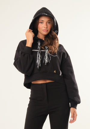 Felpa crop con tasca a marsupio e ricami a contrasto di colore, cappuccio fisso con coulisse, maniche lunghe, interno felpato