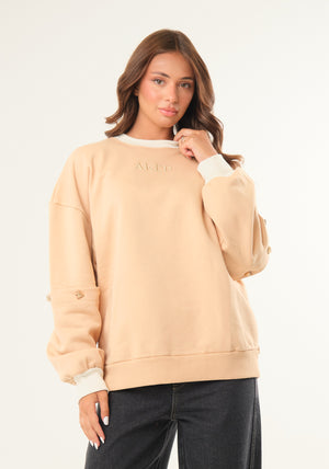 Felpa over girocollo con maniche apribili con chiusura con bottoni logati, dettagli in maglia elastica a contrasto di colore, interno garzato