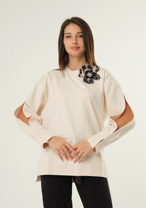 Felpa over in punto milano a maniche lunghe con polsino aperto, taglio asimmetrico con spacco laterale, scollo rotondo, spilla a fiore removibile