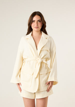 Giacca ampia con tasconi in leggero tessuto scuba, revers classici, senza chiusura con cintura coordinata removibile