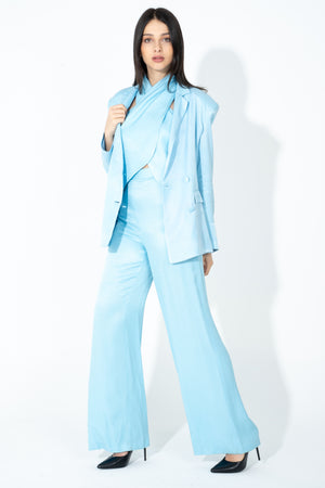 Giacca doppiopetto a tessuto lucido tramato, maniche lunghe con spalline interne, tasche laterali, chiusura frontale con bottoni in tinta