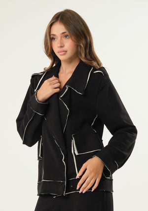 Giacca in felpa con dettagli a contrasto di colore e a taglio vivo, modello biker con chiusura laterale, colletto ampio, chiusura laterale nascosta, interno garzato