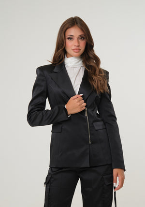 Giacca in raso con zip, maniche lunghe, patte decorative frontali, chiusura frontale con zip, spalline e fodera interna