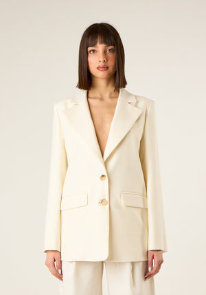 Giacca monopetto allungata a taglio sartoriale, maniche lunghe con spalline interne, patte laterali, chiusura frontale con bottoni