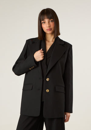 Giacca monopetto allungata a taglio sartoriale, maniche lunghe con spalline interne, patte laterali, chiusura frontale con bottoni
