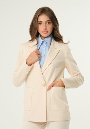 Giacca monopetto in punto milano con ampie tasche laterali, scollo e revers a punta, maniche lunghe, spacco su fondo posteriore, chiusura frontale con bottone dorato, spalline interne
