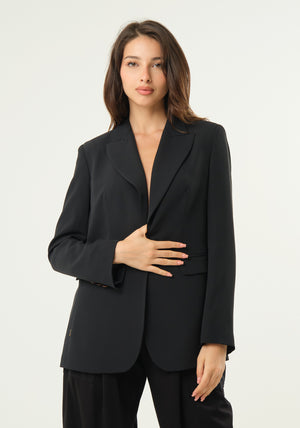 Giacca monopetto in tessuto fermo con revers a punta, pences frontali, chiusura frontale con bottone anticato, maniche lunghe, fodera e spalline interne