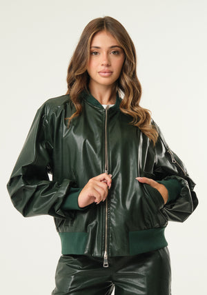 Giubbino bomber in ecopelle con maniche lunghe arricciate, dettagli in maglia elastica in tinta, tasche laterali, scollo rotondo, chiusura frontale con zip