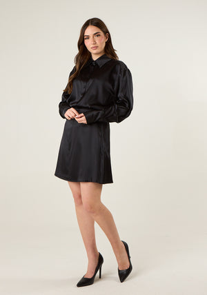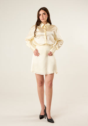 Gonna corta in seta, vita alta e svasata con chiusura laterale con zip nascosta