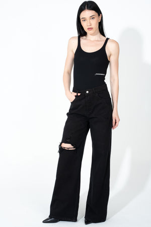Jeans con rotture, gamba dritta e vita alta con passanti, cinque tasche, chiusura frontale con bottone e zip centrale