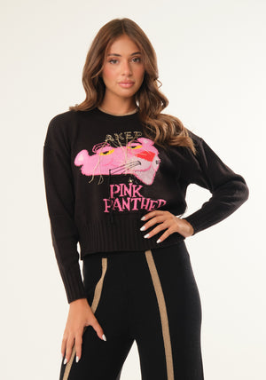 Maglione con ricamo Pantera Rosa frontale a contrasto di colore, scollo rotondo, maniche lunghe e taglio a scatoletta