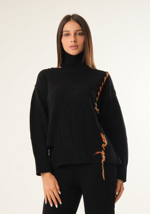 Maglione in pura lana a collo alto, aperture e maniche lunghe, scollo rotondo e fili colorati a contrasto di colore