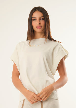T-shirt con ampio giromanica, scollo rotondo, ricamo logato frontale a contrasto di colore, taglio dritto