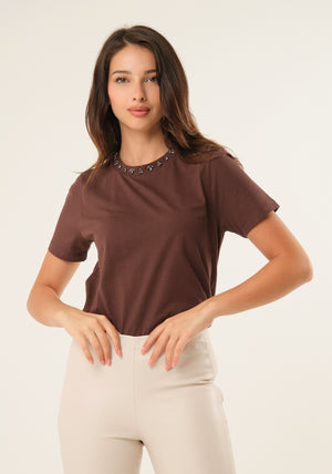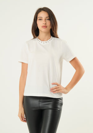 T-shirt con pietre preziose su scollo rotondo, mezze maniche, taglio dritto, chiusura posteriore a goccia con bottone