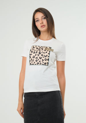 T-shirt con stampa animalier frontale, scollo rotondo, taglio dritto, mezze maniche